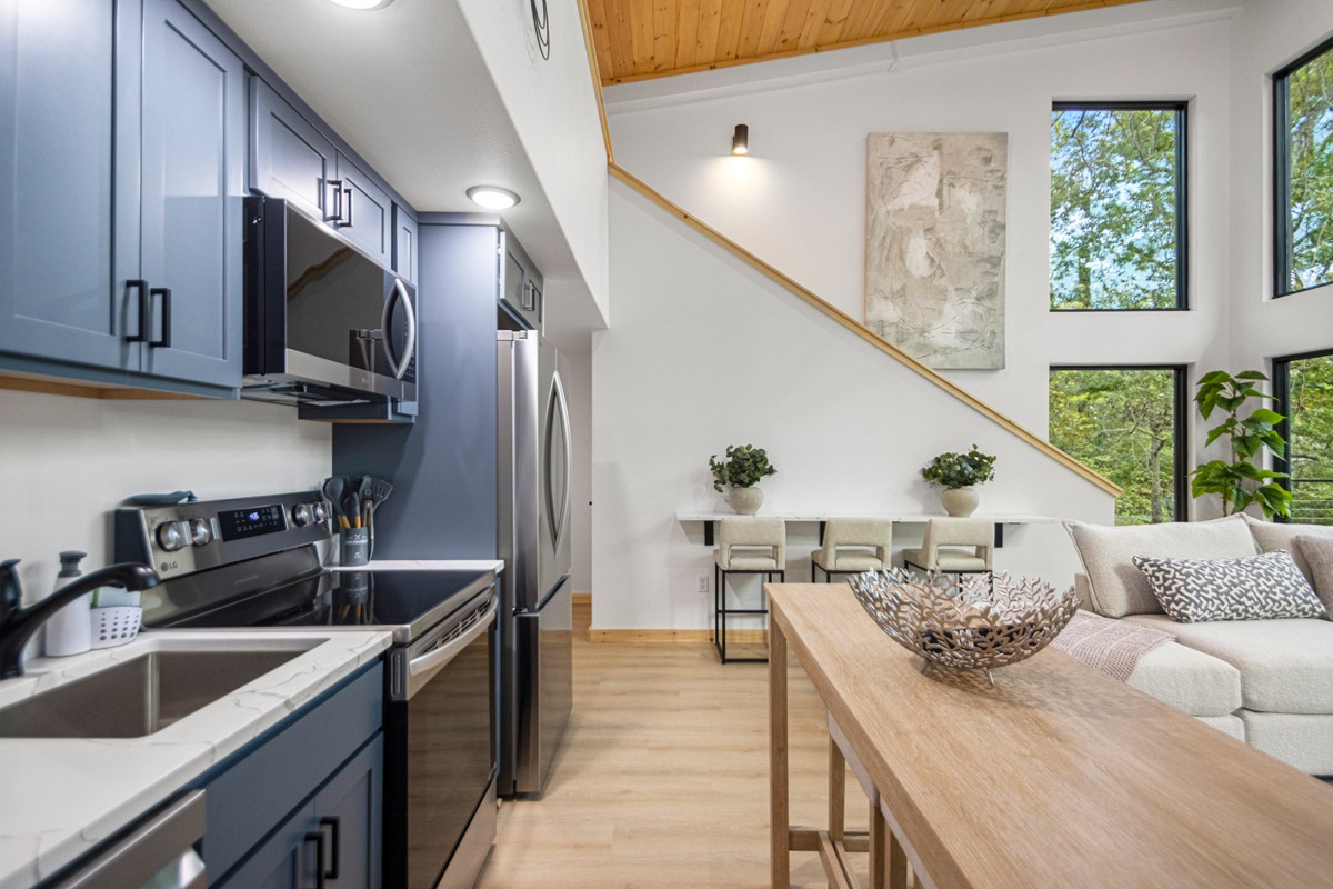 Step inside and feel the calm of a clean, modern aesthetic—soft, neutral tones, high-end furnishings, and floor-to-ceiling windows that blur the line between indoors and nature. The open-concept living area includes modern seating, a sleek electric fireplace, and a full kitchen with quality appliances and island bar seating—perfect for cooking, lounging, or sipping coffee with a view.