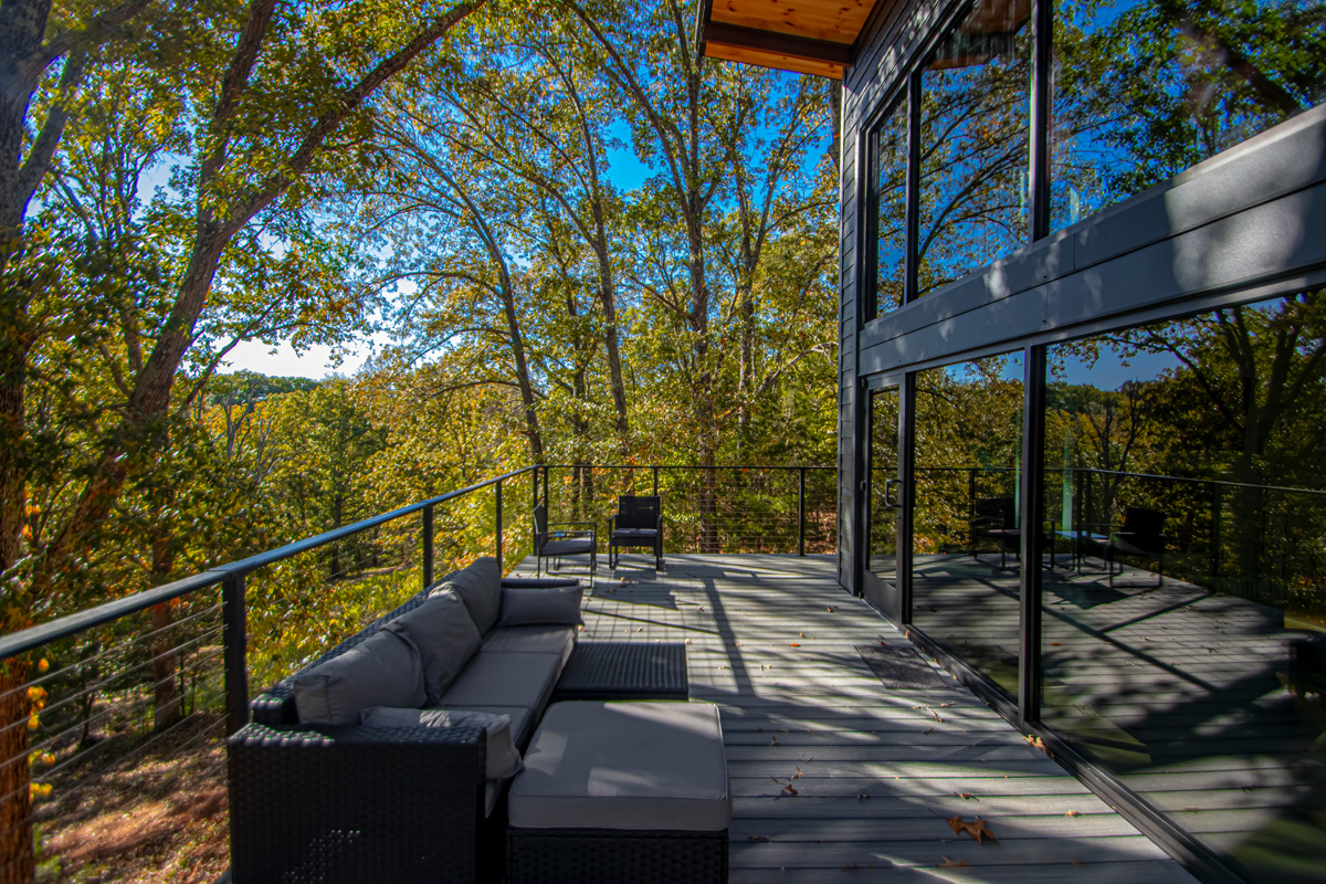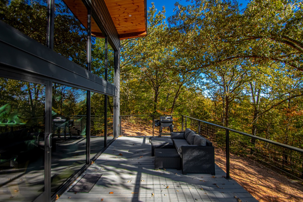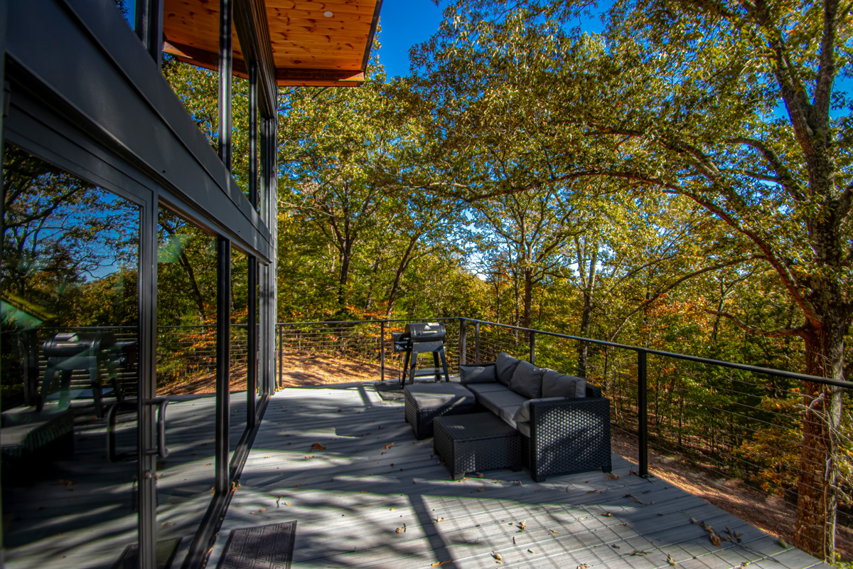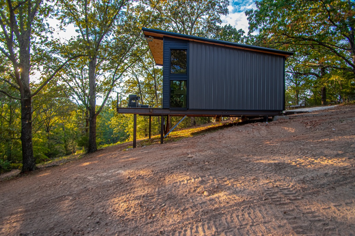 Welcome to The Ember Cabin, a stunning modern retreat where comfort and design flow effortlessly with nature. Perched on an elevated platform surrounded by the Ozark landscape, this luxury cabin invites you to unwind in style while taking in peaceful views through floor-to-ceiling glass windows that blur the line between indoors and out.