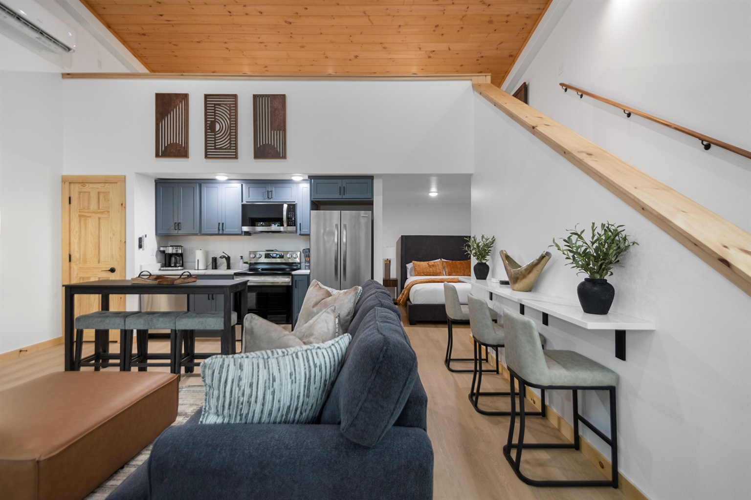 Inside, the open floor plan creates a seamless space for relaxing and gathering. The modern electric fireplace casts a warm glow across the rich wood tones and contemporary furnishings, setting the tone for a serene and stylish stay.