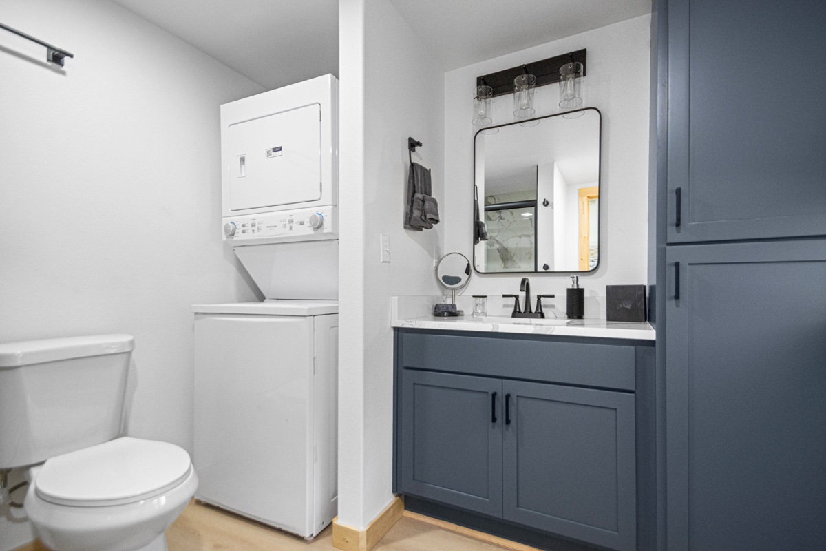 Downstairs, you’ll find a gorgeous comfortable queen bedroom. Upstairs, the loft features two queen beds, providing plenty of sleeping space with a touch of modern luxury. The spa-inspired bathroom includes a walk-in glass shower and elegant finishes that add to the cabin’s refined feel.
